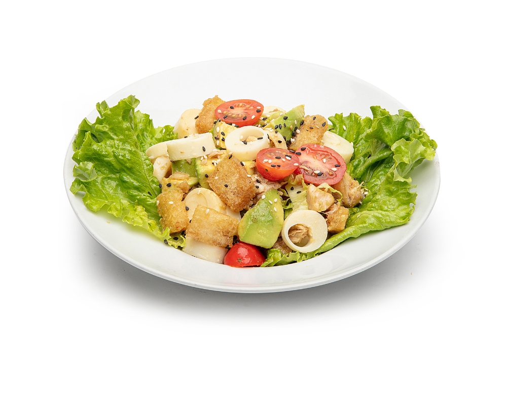 Laitue, crevettes, calamars, mangue, concombre, maïs, cœur de palmier